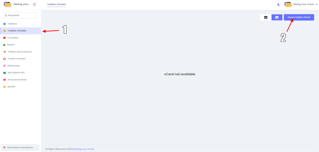 Para crear una vCard tienes que ir a la opción que se llama tarjetas virtuales y después seleccionar la opción nueva tarjeta virtual