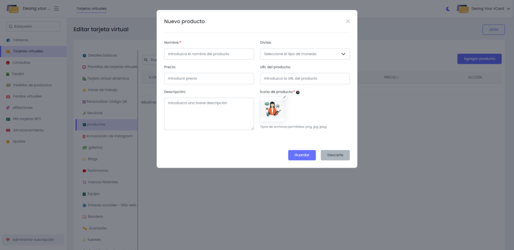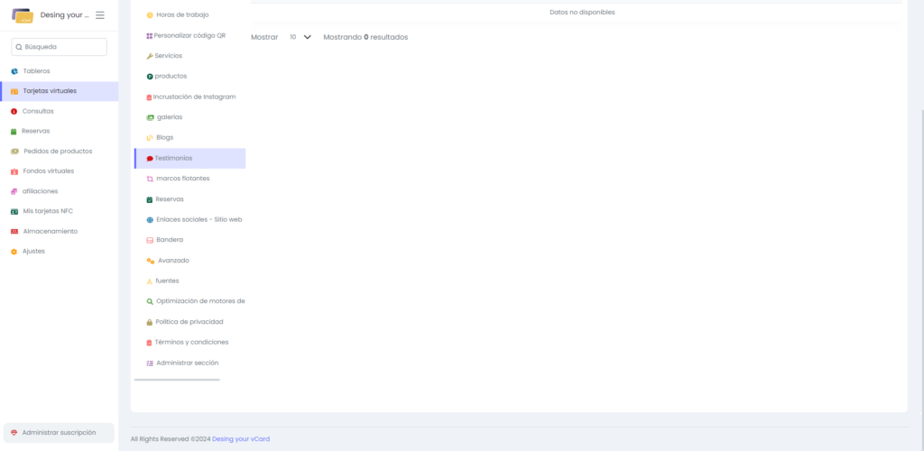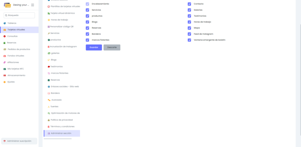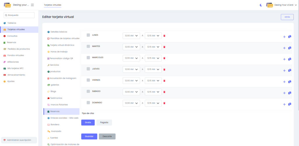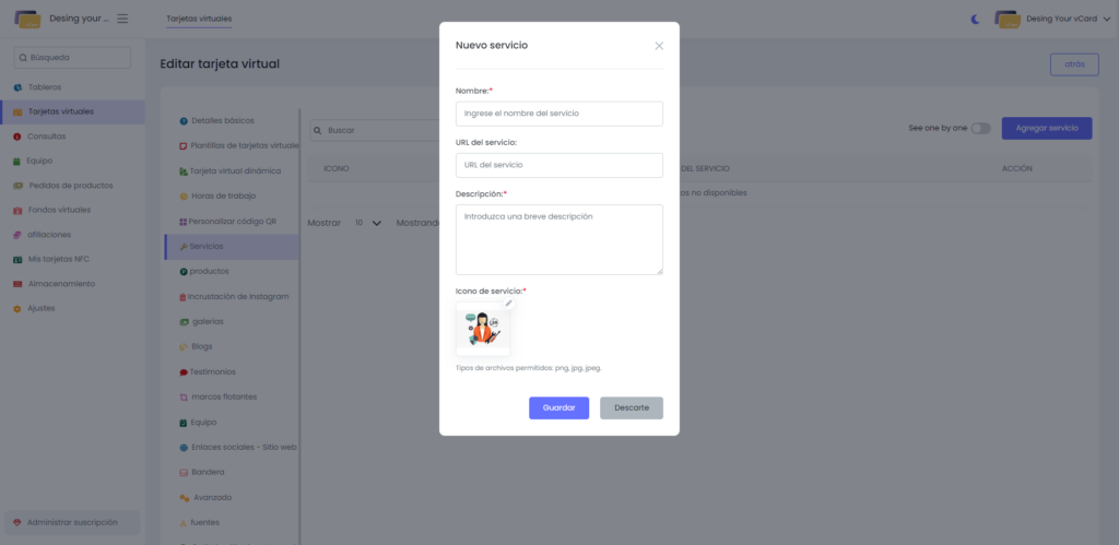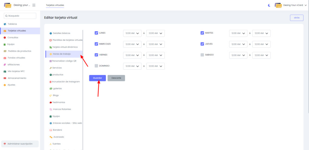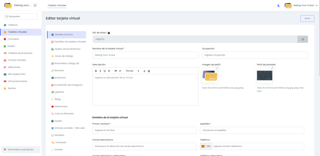 El proceso de crear tu vCard es simple: solo necesitas rellenar los datos en cada sección y guardar al final de cada una. No es obligatorio completar todos los campos; por ejemplo, puedes omitir el horario de atención o los testimonios si prefieres. Sin embargo, mientras más información incluyas, más completa será la tarjeta que verán tus clientes.