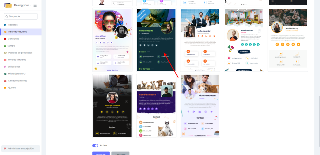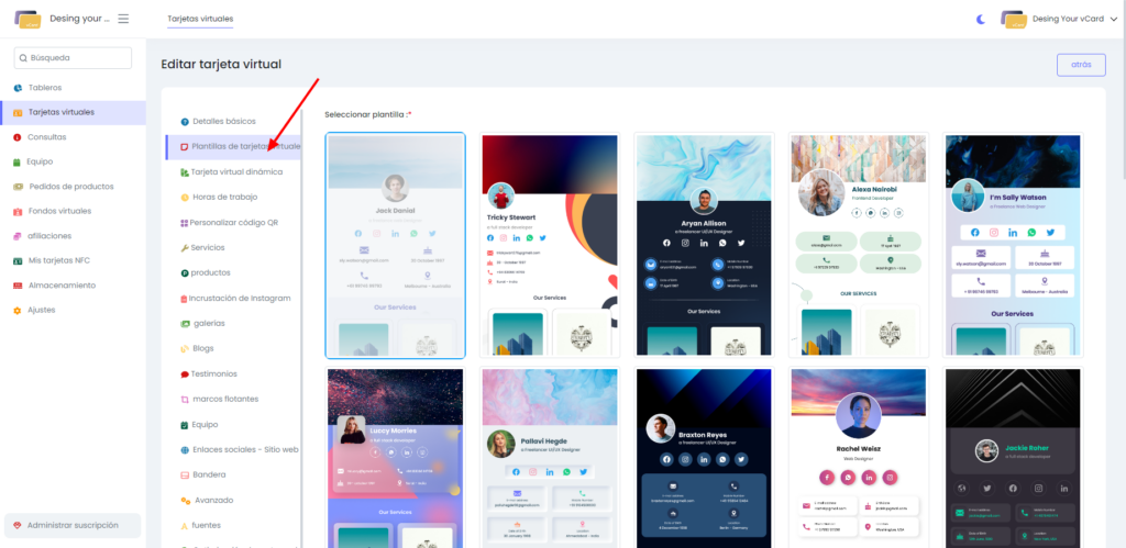 La creación de tu vCard es intuitiva, y los campos de cada apartado son fáciles de completar. Además, en la sección de «Plantillas», puedes elegir entre 31 modelos de tarjetas virtuales. Uno de estos modelos se destaca como «Tarjeta Virtual Dinámica», ofreciendo funciones especiales.