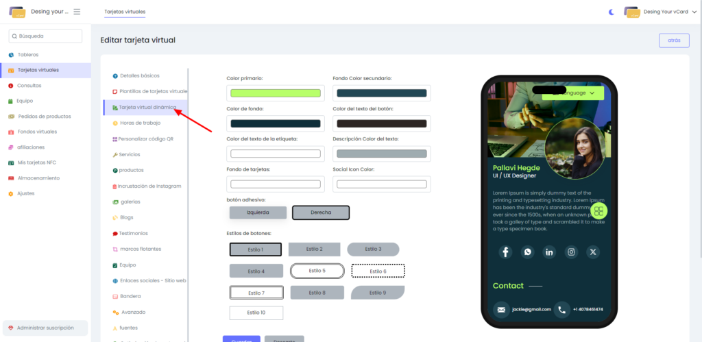 Al rellenar todos los datos y darle a guardar se te abrirá un gran abanico de opciones para personalizar tu vCard
