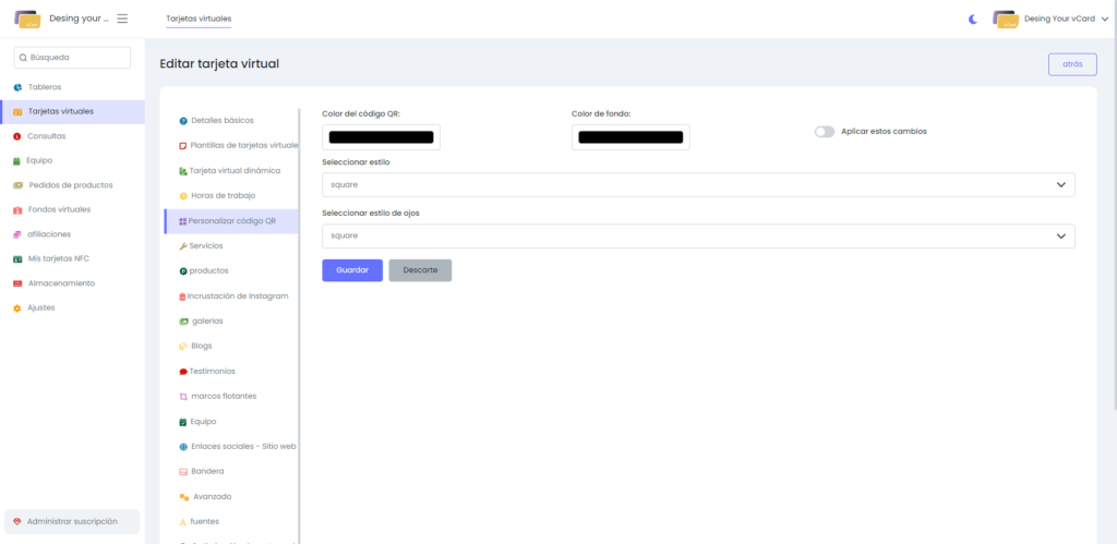 Aquí podréis modificar tanto el color del código QR como el diseño de el estilo, marcar la opción de aplicar estos cambios para aplicar los colores y siempre al final guardar