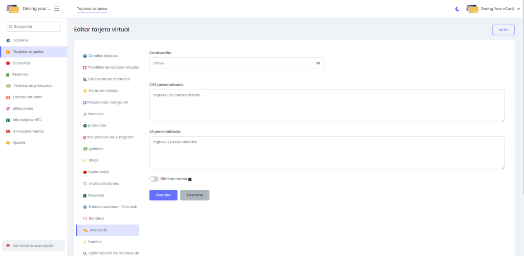 Desde aquí podrás poner una contraseña a tu vCard en caso de que lo necesites, añadir CSS Y JS personalizado y además eliminar la marca de nuestro negocio para que no salga nada de desingyourvcard