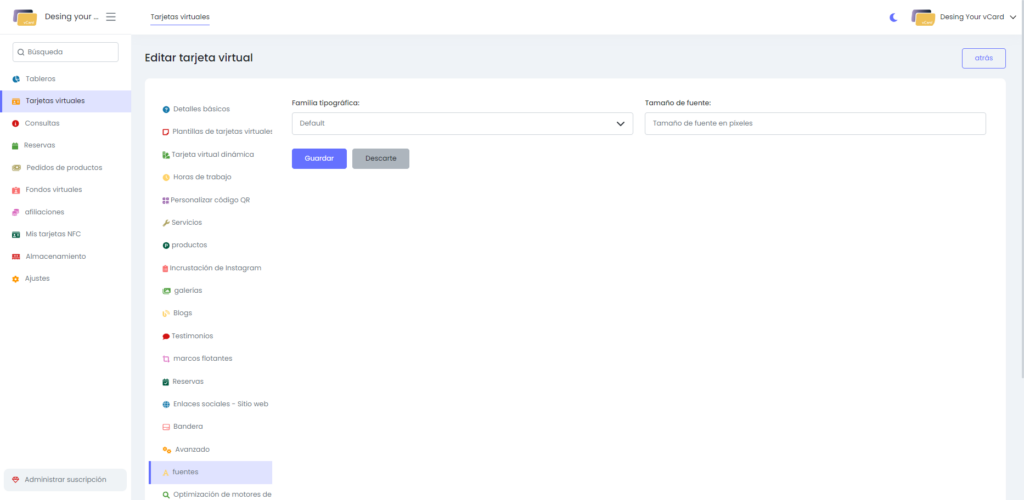 En esta sección podrás editar tanto el tipo de letra como l tamaño de los títulos de tu vCard
