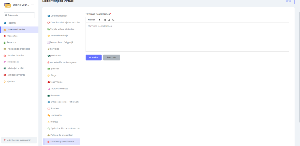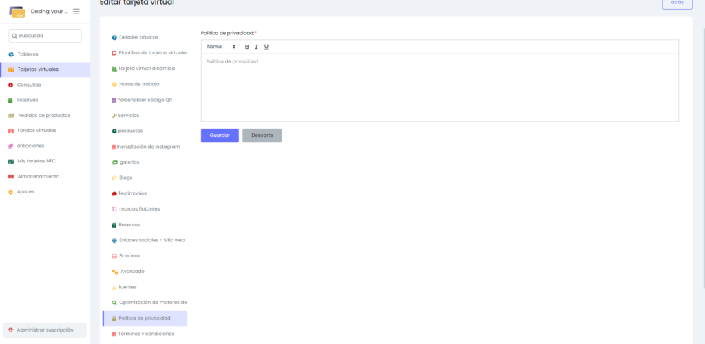 En estas dos secciones podrás añadir la política de privacidad y los términos y condiciones de tu negocio